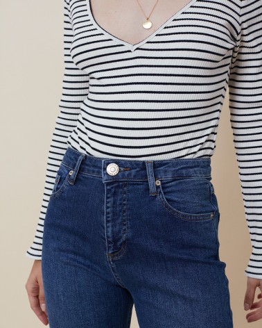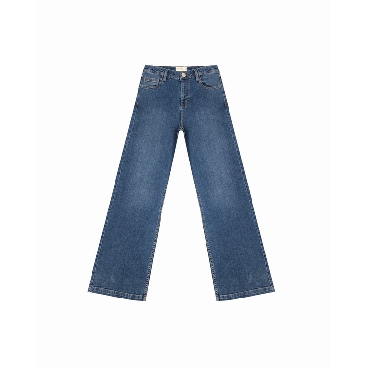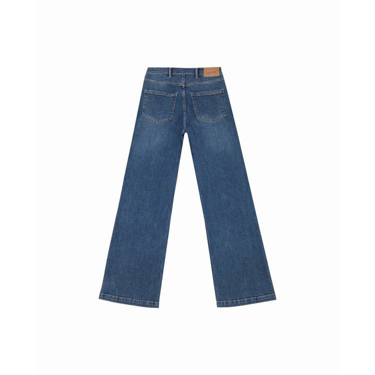 Jean 5 poches, taille haute, jambes larges et légèrement évasées. Fermeture à glissière et bouton siglé. Passants et détail de jacron en cuir véritable sur la ceinture.