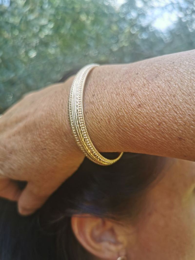 Ce jonc ouvert s'adapte à toutes les tailles de poignet. Il capte la lumière et saura embellir toutes vos tenues en toute simplicité.