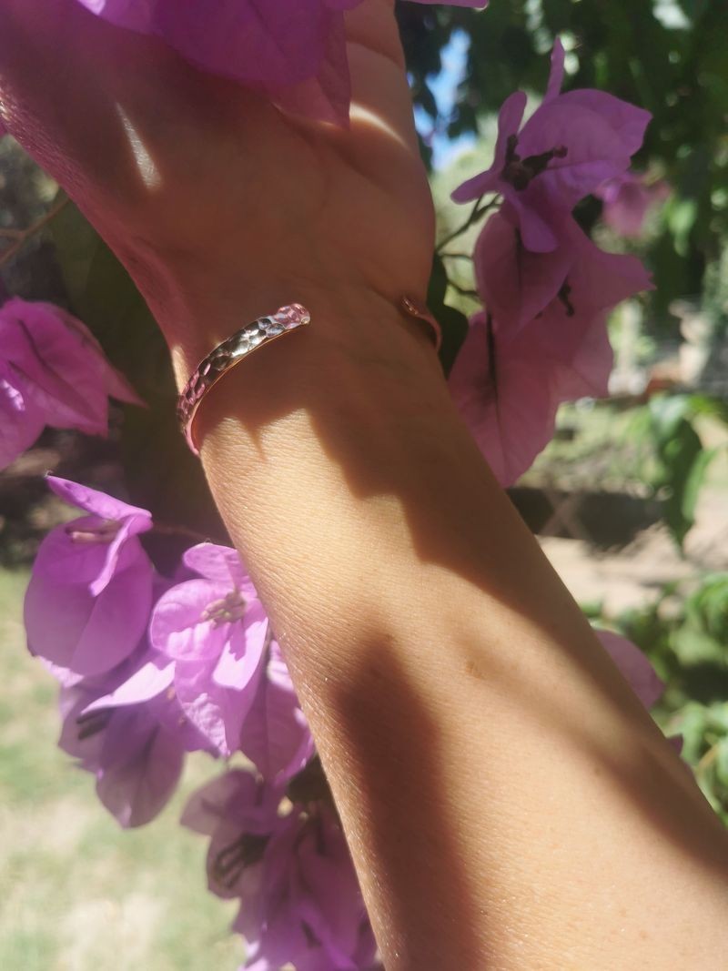 Ce jonc martelé habille par sa simplicité ,il reflète la lumière ,sobre et chic ,c'est un intemporel à avoir dans sa boite à bijoux!